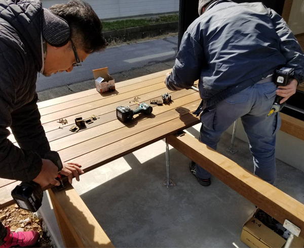 こんにちは 工務部の髙津です。 先週、只今見学会を開催させていただいているお家で ウッドデッキを作成してきました。 何もない状態から、まず高さを合わせながら土台を組んでいきます。 土台が高すぎたり、低すぎたり、水平でないと 完成した時が不細工になってしまうので丁寧に確認しながら作業をしていきます。 その後、床となる板を均等に並べていきます。 すべての板がきれいに並べられるように頻繁に微調整を行っておられました。 完成しますと、外壁にも合うかっこいい雰囲気になりました。 皆様も、ぜひウッドデッキの心地よさを体感してみてください。 | ![]() RECENT ENTRY 2021.04.06